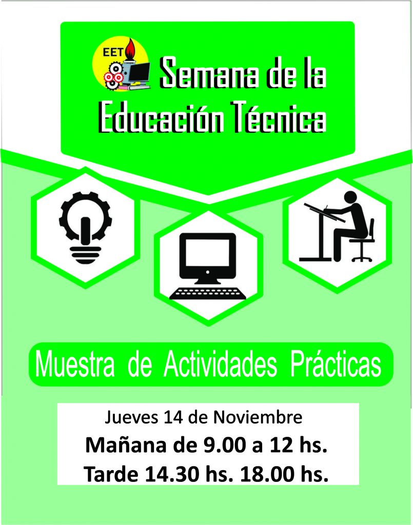 Con motivo de celebrarse la Semana de la Educación Técnica, se llevara a cabo en las instalaciones de nuestra escuela, la muestra de las actividades practicas desarrolladas durante el año. La misma se realizará en los horarios de 9.00 a 12 hs. y de 14.30 a 18.00 hs. Invitamos a toda la comunidad educativa a visitarla.