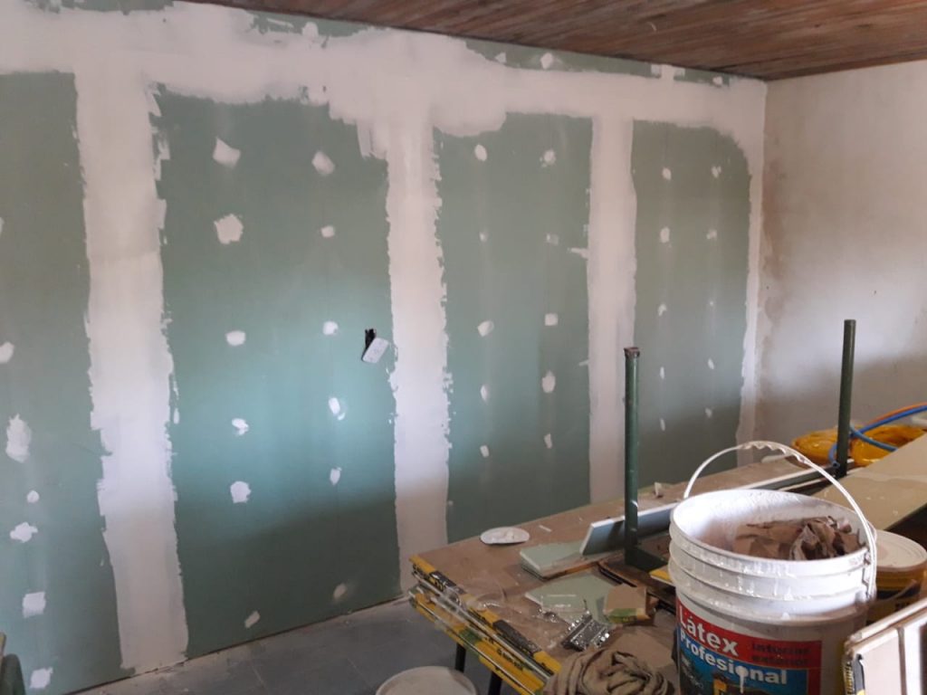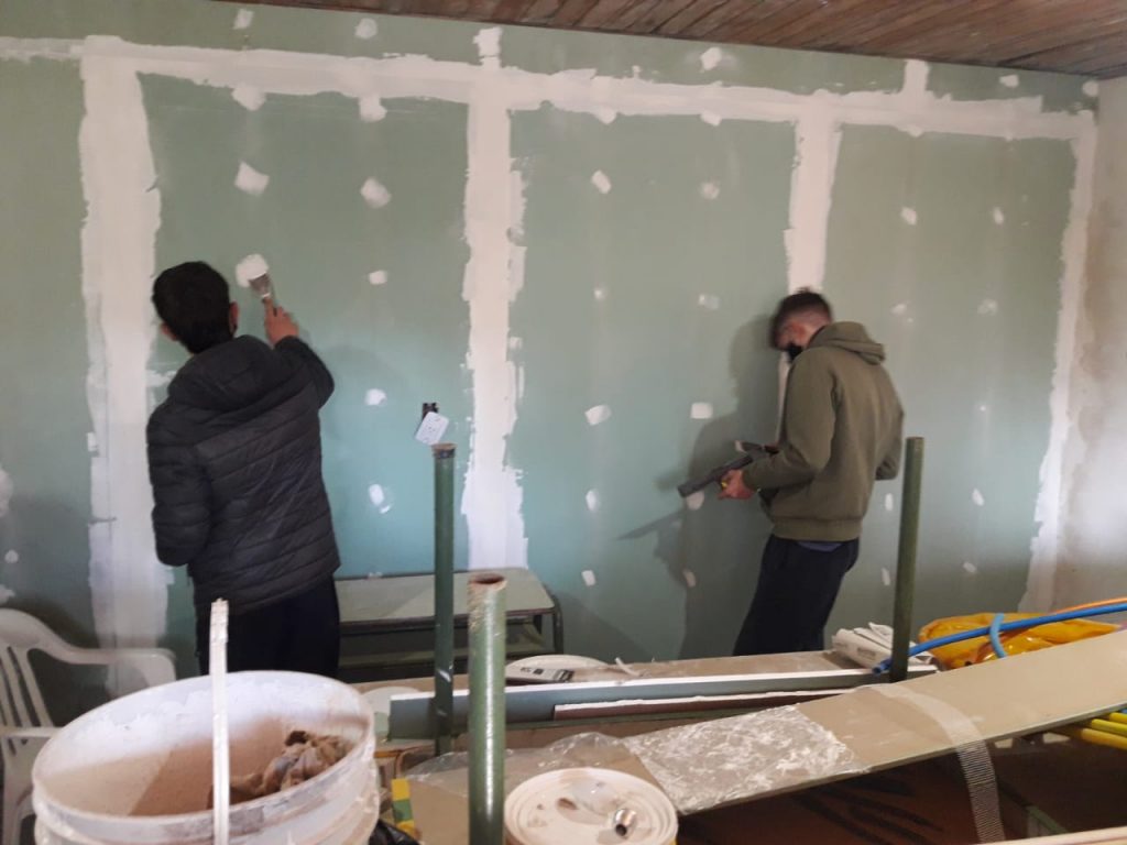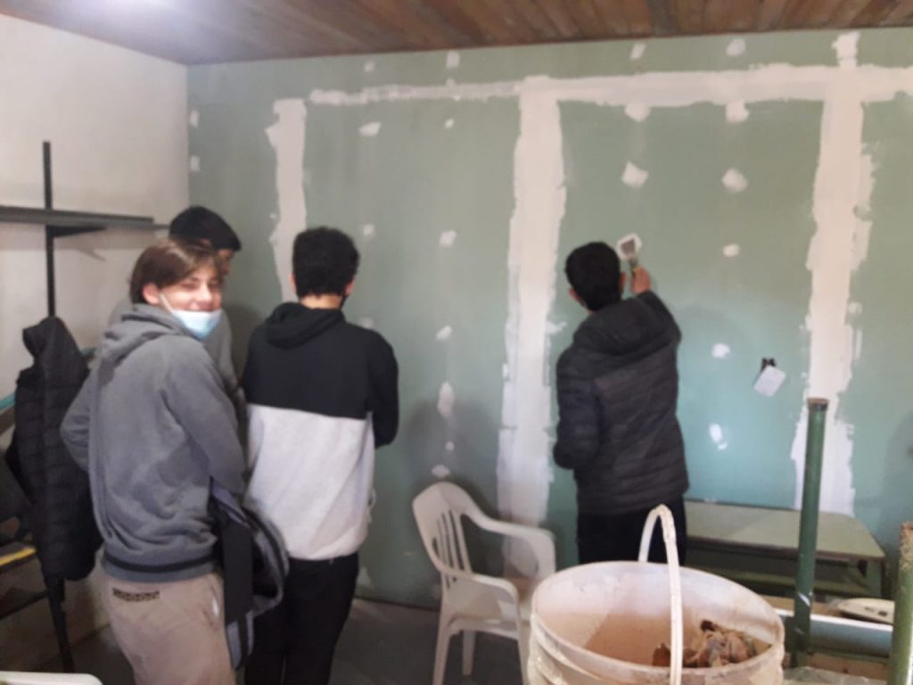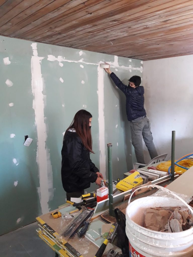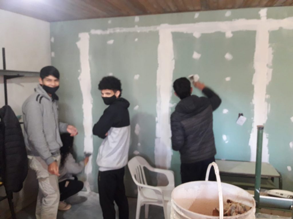 Estudiantes de la Especialidad Construcciones realizando un trabajo de construcción en seco en la Escuela Especial N°7 «Dr. Luis A. Guido» con el profesor del taller de Trabajos Prácticos de la Especialidad Sergio Mieras