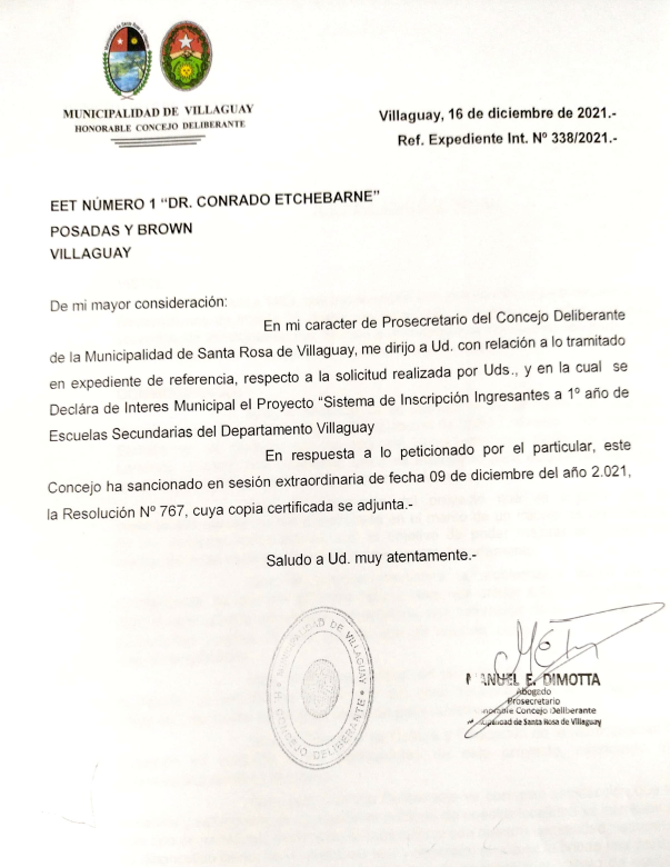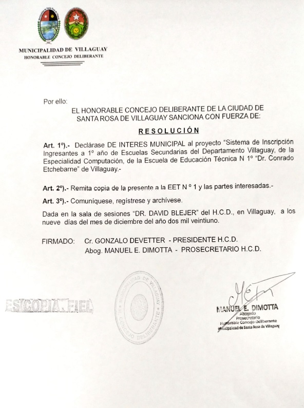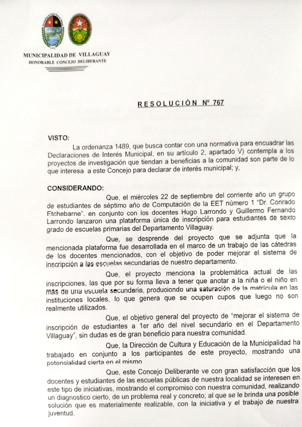 Durante este año los estudiantes de 7° Computación Abigail, Laurencio, Penélope, Tomás, Bárbara, Jésica, Natalí, Guadalupe, Franco y Diego junto a sus docentes Hugo y Guillermo Larrondo realizaron un proyecto que se destaca, no solo por lo innovador y por dar una respuesta a una problemática, sino que su trabajo se transformó en un servicio a la comunidad. El Honorable Concejo Deliberante de la Municipalidad de Villaguay reconocio el proyecto elaborado y ejecutado por este grupo de alumnos “Inscripción Virtual Departamental a 1er. Año de Nivel Secundario” a través de la Resolución 767/21 declarandolo de Interés Municipal.