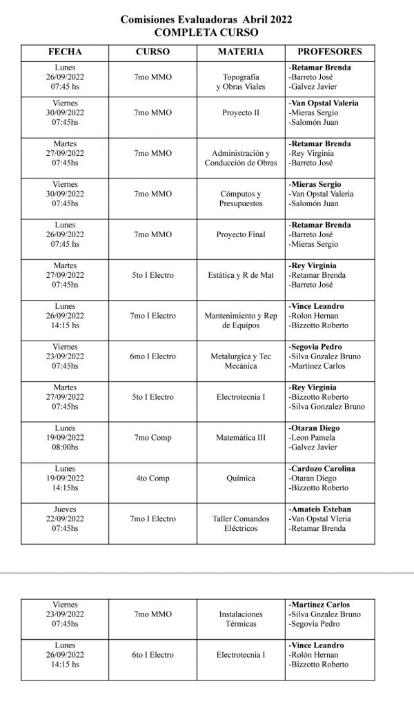 Cronograma Mesas completa curso Septiembre 2022