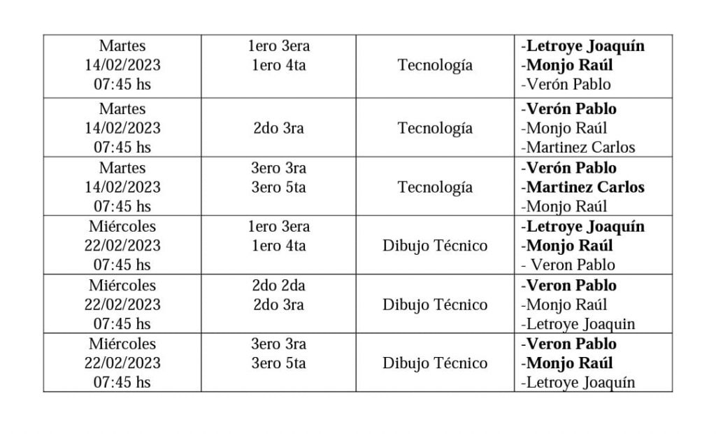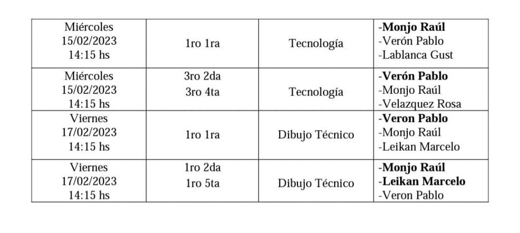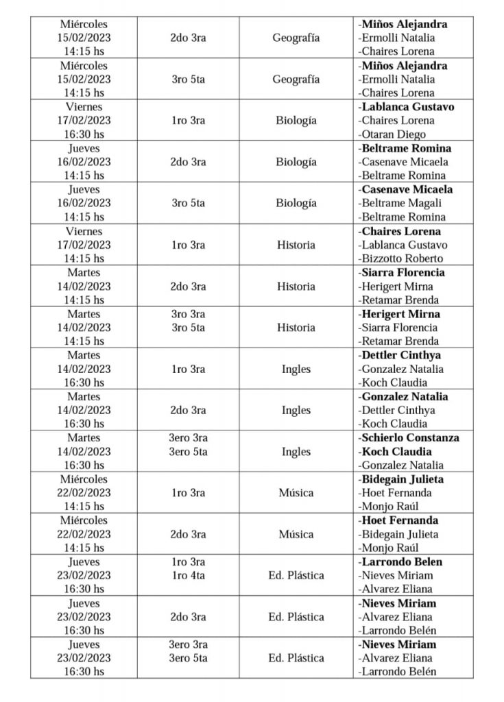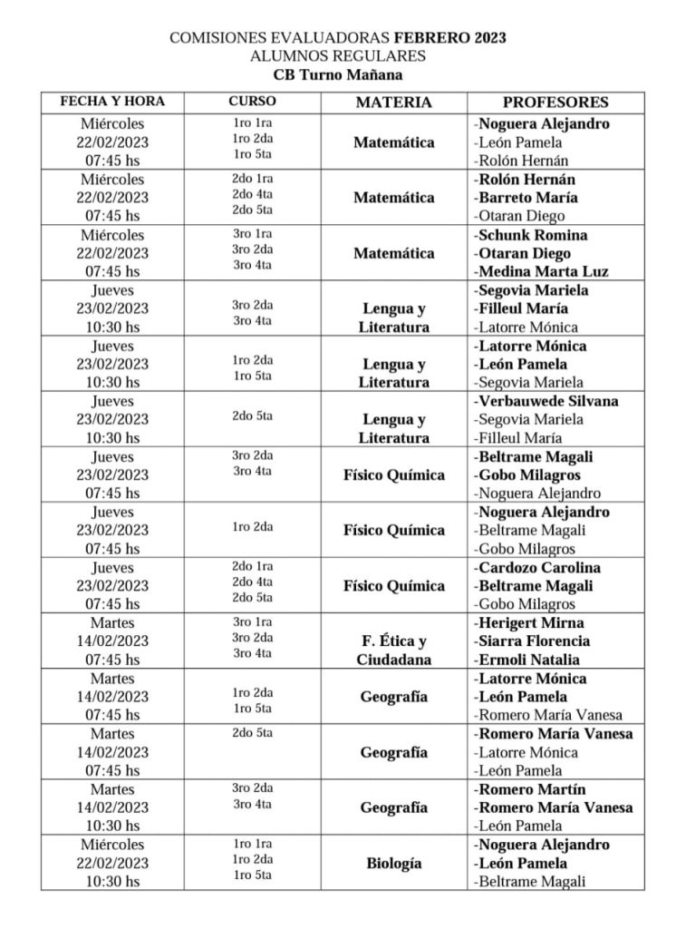 Mesas Examinadoras – Estudiantes Regulares (Ciclo Básico Turno Mañana, Ciclo Básico Turno Tarde, Ciclo Superior Turno Mañana y Ciclo Superior Turno Tarde).