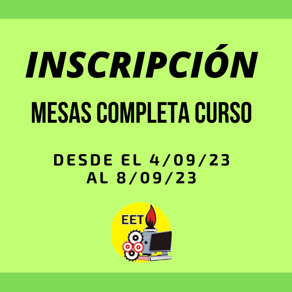 Desde día Lunes 4 y hasta el Viernes 8 de Septiembre inclusive, se encuentra abierta la inscripción online a las Mesas Completa Curso. Las mismas se rindesn del 18 al 22 de Septiembre.