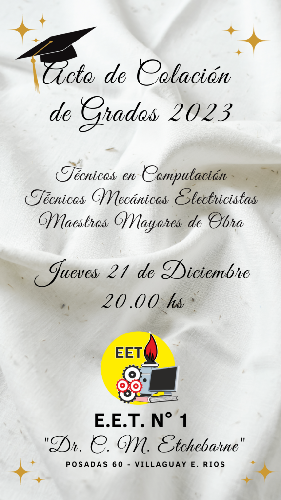 Este Jueves 21 de Diciembre a las 20.00 hs, en el patio del establecimiento, se realizará el Acto de Colación de Grados 2023, de Técnicos en Computación, Técnicos Mecánicos Electricistas y Maestros Mayores de Obra. ¡Los esperamos!